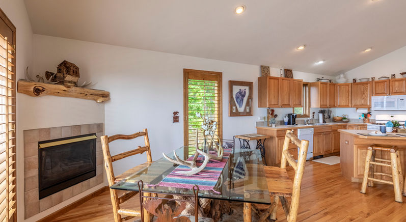 Pass through the custom wrought-iron gate on the stairs to the walkway leading to the upper-level living space! [Did I mention the views??] The great room of this raised ranch home is an all-encompassing space, including the kitchen, dining, living and bedroom, all of which resonate… MOUNTAIN! From the vaulted ceiling to the gleaming hardwood floors, pride-of-ownership is evident throughout! The kitchen area features a large island with bar seating! All the appliances are included (brand-new stove)! The windows and exterior doors have been outfitted with plantation shutters which add to the coziness! A convenient gas fireplace (with blower) adds to the ambiance of this quiet mountain studio! On this level, you’ll also find a lovely full-bath with a jetted soaker bathtub where you can soothe away the worries of life in the city!